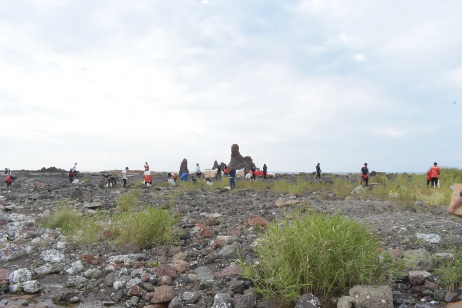海岸清掃では、地表の大きなごみが取り除かれると、その下に堆積した細かなごみが気になり出します。手前の岸がきれいになると、向こう岸が気になり出します(笑)。ということで、今回は2週間前に清掃した腰細の「向こう岸」をターゲットとして、広大な岩場を一挙にきれいにしてしまおうということになりました。